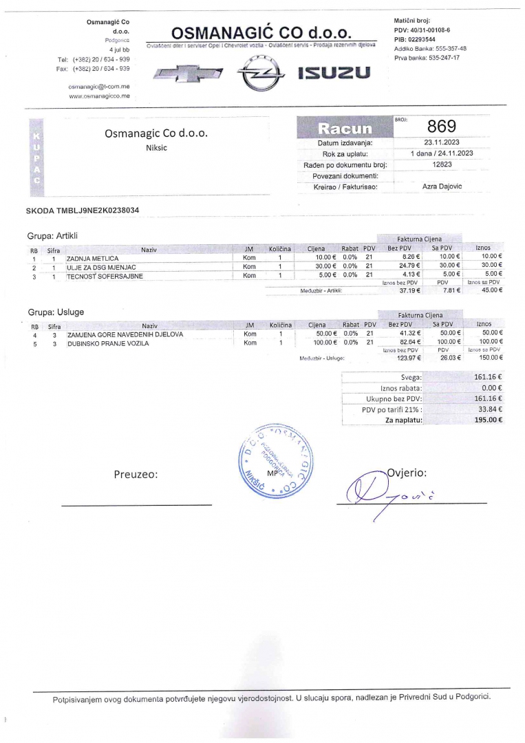 ulje u mjenjaću zamijenjeno 23.11.2023. na 103 762 km