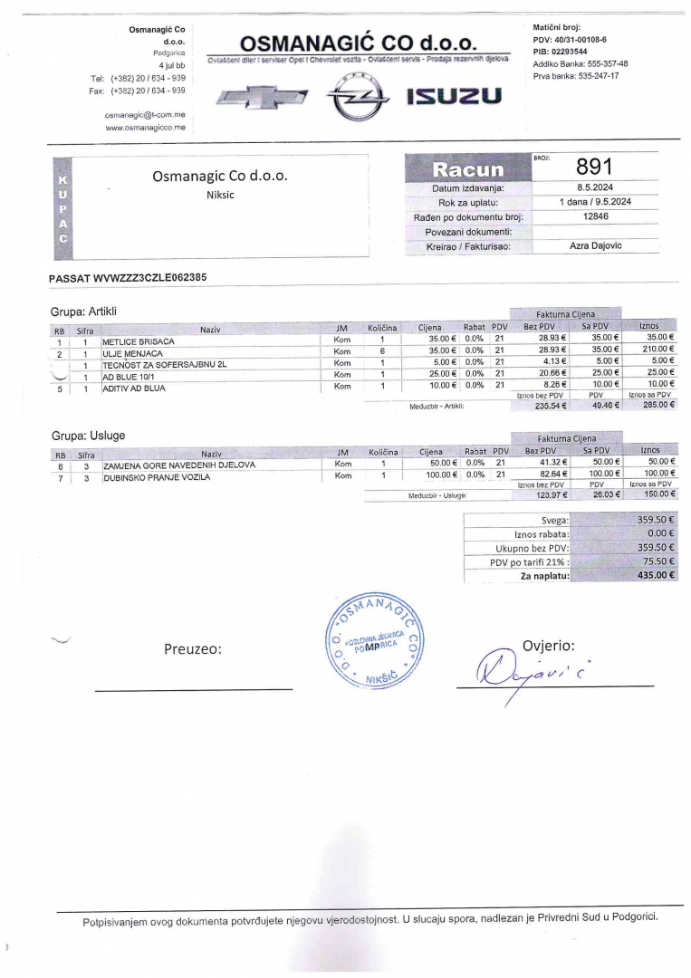 ulje u mjenjaču zamijenjeno 08.05.2024. na 154 495 km